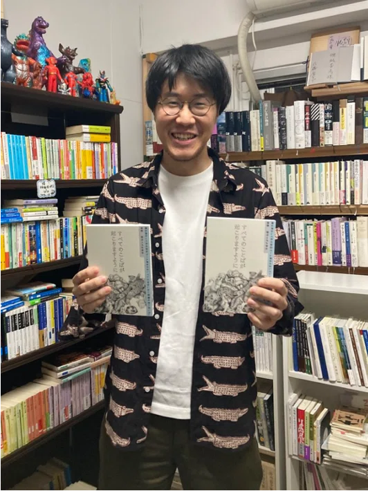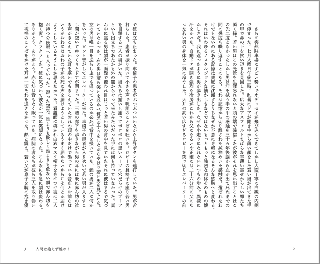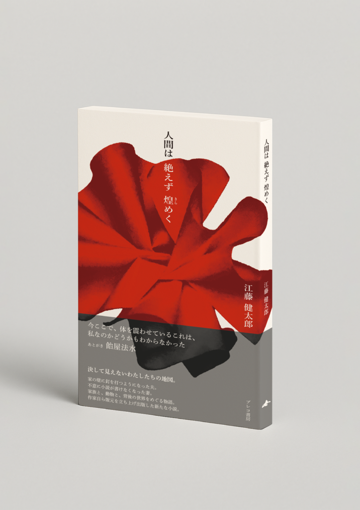 人間は絶えず煌めく 江藤健太郎 第二作品 決して見えないわたしたちの地図。 家の壁に釘を打つようになった夫。不意に小説が書けなくなった妻。家族と、動物と、背後の世界をめぐる物語。作家自ら版元を立ち上げ出版した新たな小説。 江藤健太郎『人間は絶えず煌めく』 発行所:プレコ書房発売日:2026年4月22日判型 :110mm×180mm B6判変形並製 160ページ造本 :カバーなし ニス仕上げ価格 :1,100円(税込1,210円)装丁・本文レイアウト:甘利早あとがき:飴屋法水校正 :中村外編集 :江藤健太郎印刷・製本:藤原印刷ISBN:978-4-9913956-1-1 ご購入:プレコ書房オンラインショップ ご購入:Amazon あとがき 飴屋法水(演出家) ©花代 彼から、江藤君から、「あとがき」を書いて欲しいんです、この本の、2冊目の僕の新しい小説の、そう言われてから、もう、ずいぶんと時間が経ってしまっていたどうして? よくわからないなあ、どうして君の小説のあとがきを僕が書くの?そんな奇妙な注文に、どう応えて良いかわからなかった、よくわからないんです自分でも、そりゃそうだろうねえ、そうなんです、結局、勘のようなものとしか、えーと、勘という言葉、君の小説の中によく出てくるね、出てきますね、はい、出てくるけどさ、そんな何でもかんでも、勘で片付けてしまっていいのかなあ? 江藤君は黙っている 推薦 野生と知性の融合したダンス。タコみたいだ。小説そのものに生命が宿っている。 ——岸波龍(機械書房 店主) ◎江藤健太郎による第二作品。自ら立ち上げたひとり出版レーベル「プレコ書房」より刊行。いわゆる純文学系の作家個人による自主制作本としては、異例の第1刷2000部発行。全160頁。表題作の長編のみを所収。◎演出家の飴屋法水氏による、「解説」ではなく「あとがき」を所収。◎突然仕事を辞め、家の壁に釘を打つようになった夫牧野。不意に小説が書けなくなった妻みなも。途切れた小説を続けるべく、夫婦は東京から名古屋へと向かう。そして、牧野は二人になる……。喋るぬいぐるみ。死神みたいな三人の男。世界と時間に背く人。結婚とは何だ、人間とは何だ。家族と、動物と、背後の世界をめぐる物語。◎作家自らが企画・編集すべて手43掛けた渾身の一冊。装画・装丁はデザイナーの甘利早、印刷・製本は藤原印刷。◎カバーなし。見返しあり。ペーパーバックを髣髴とさせる縦長の判型。薄くて、軽く、値段もお手頃。小説本なのに手に取りやすく、思わず買ってみたくなる装丁になりました。 あらすじ(試し読みアリ) 人間は絶えず煌めく ◎試し読みアリ(上記タイトルをクリック) 突然仕事を辞め、家の壁に釘を打つようになった夫牧野。不意に小説が書けなくなった妻みなも。途切れた小説を続けるべく、夫婦は東京から名古屋へと向かう。そして、牧野は二人になる……。喋るぬいぐるみ。死神みたいな三人の男。世界と時間に背く人。結婚とは何だ、人間とは何だ。家族と、動物と、背後の世界をめぐる物語。 著者 江藤健太郎(えとうけんたろう) 1999年生まれ。2025年、ひとり出版レーベル「プレコ書房」を立ち上げ、初小説集『すべてのことばが起こりますように』を自ら刊行。 ほかに『ひとり出版流通攻略ガイド』(タコシェ) お取り扱い書店 以下の書店にてお取り扱いしていただいています。在庫切れの可能性もありますので、ぜひ来店前に書店様へご確認ください。 今後更新! または、下記オフィシャル販売サイトにてご購入ください。書店での購入を検討される場合は、書名をお伝えいただければ、若干お時間をいただきますが、お取り寄せいただけます。 プレコ書房オンラインショップ ご購入:Amazon 書店のみなさまへ 直取引、または、鍬谷書店経由でのお取引にて承ります。直取引の場合の条件は、・買切6.5掛け(委託はご相談ください)・最小ロット1冊から・送料は版元負担です。詳しい販売条件については、以下の「書店さま向け注文フォーム」にてご確認ください。 書店さま向け注文フォーム ご感想など ご感想などは以下のフォームにお書きいただけると幸いです。 ご感想フォーム お問い合わせ:k.etoetoeto@gmail.com(プレコ書房 江藤)